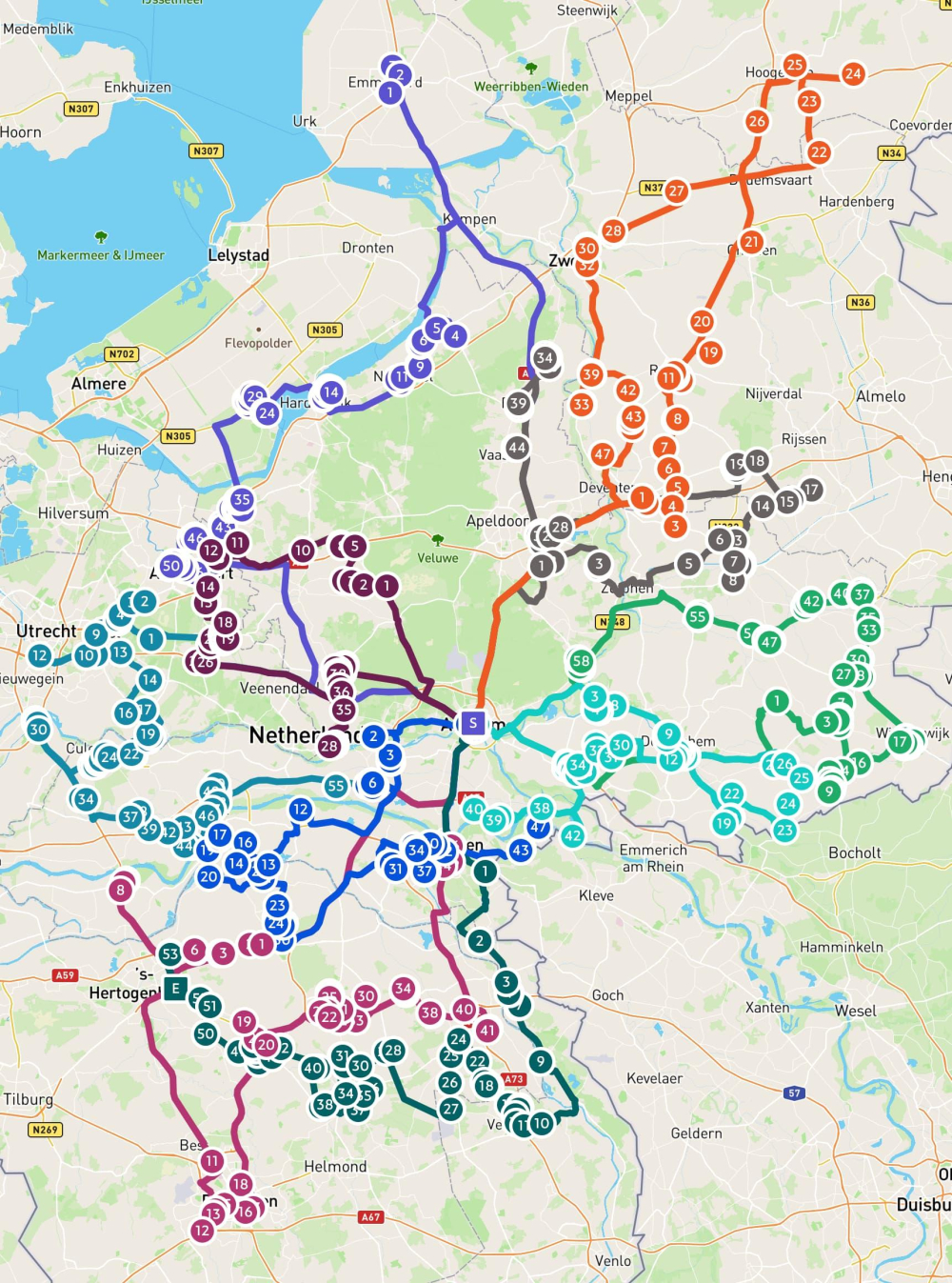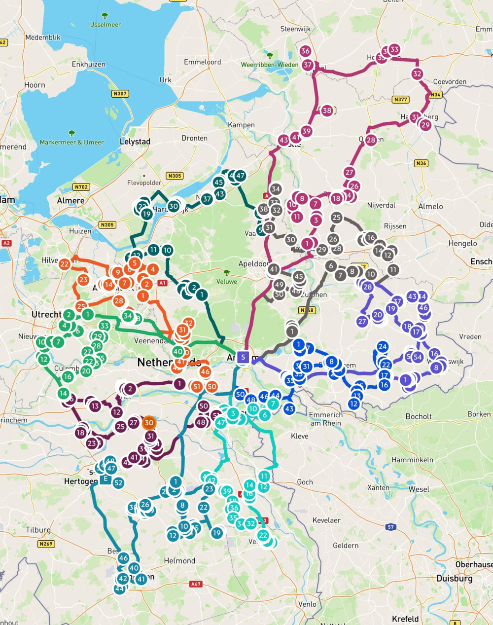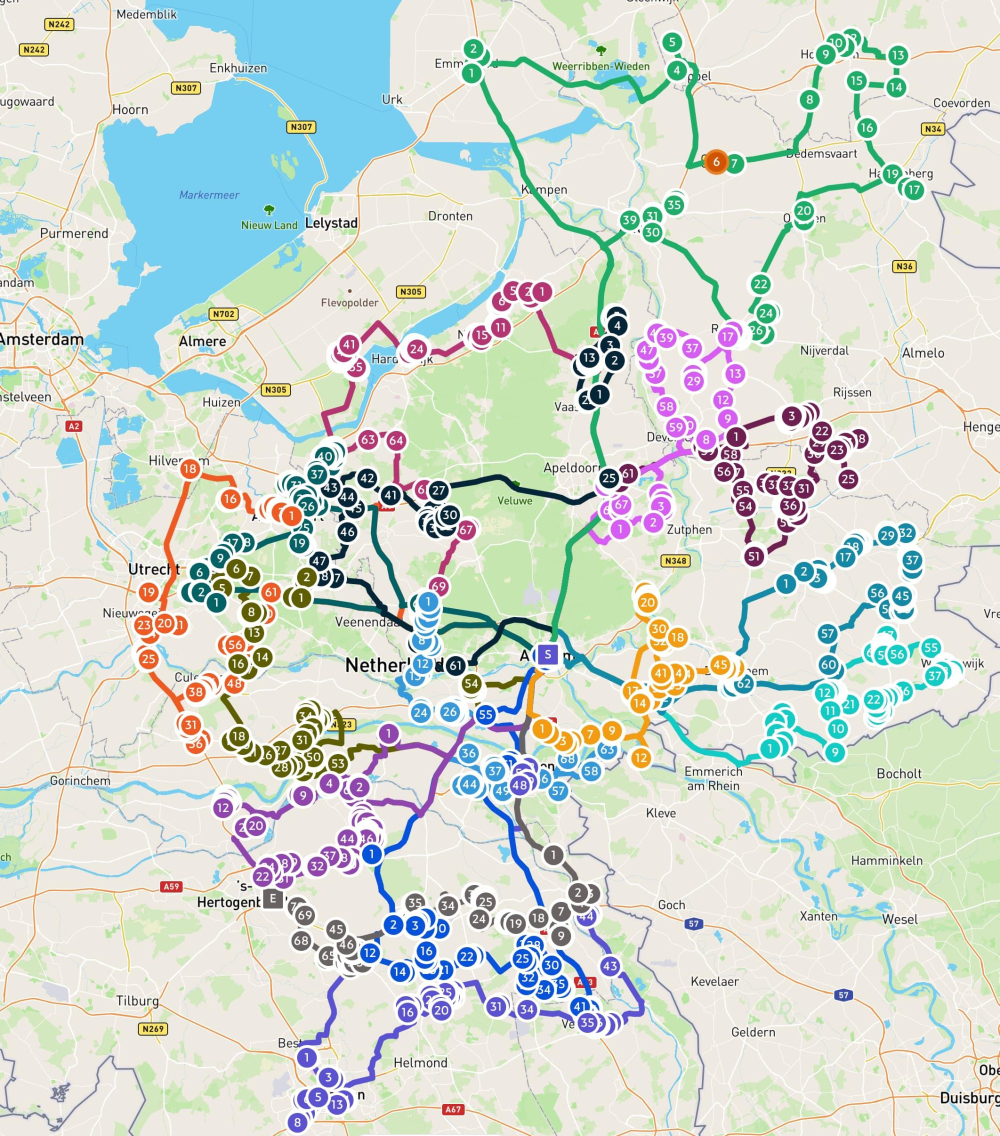 Originele route - alle ruim 1.000 klanten ingedeeld in 16 verschillende vaste routes, 16 voertuigen nodig om op tijd te kunnen bezorgen: