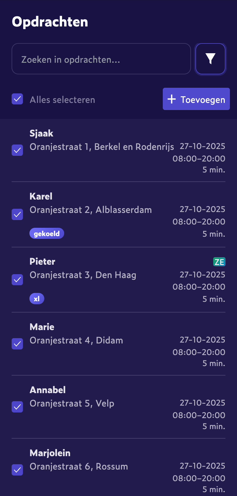 - In het overzicht van opdrachten zie je nu ook de woonplaats die bij het adres hoort.